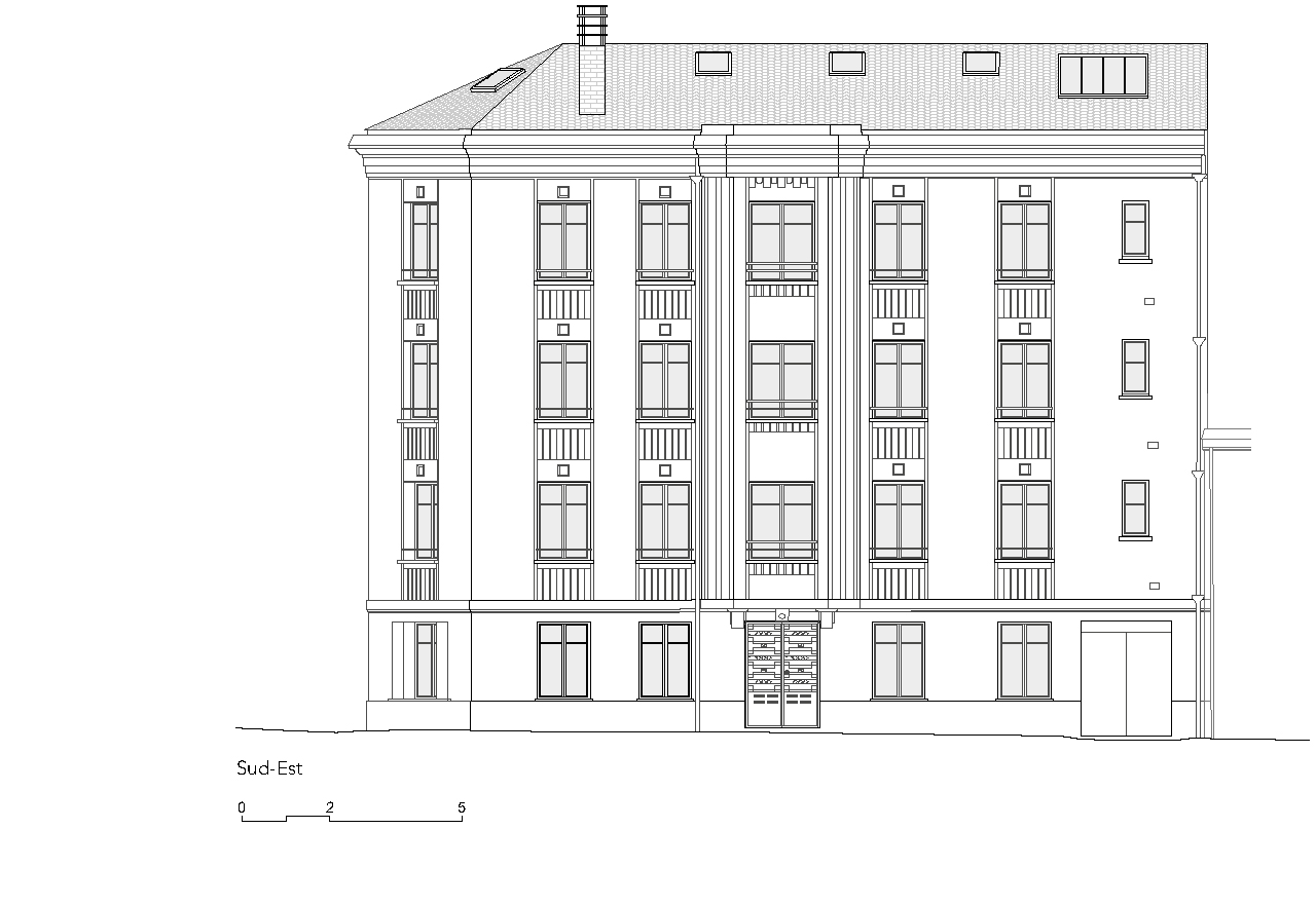 A deux pas du Jardin Public, cette œuvre mixte, (ode de la pierre modénaturée et des prémices du béton) se situe au croisement de la rue Mandron et de la rue Saint Hubert.